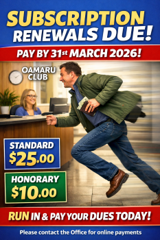 Just a wee reminder Subs are due for renewal on or before 31st March 2026, Standard members $ 25.00, Honorary